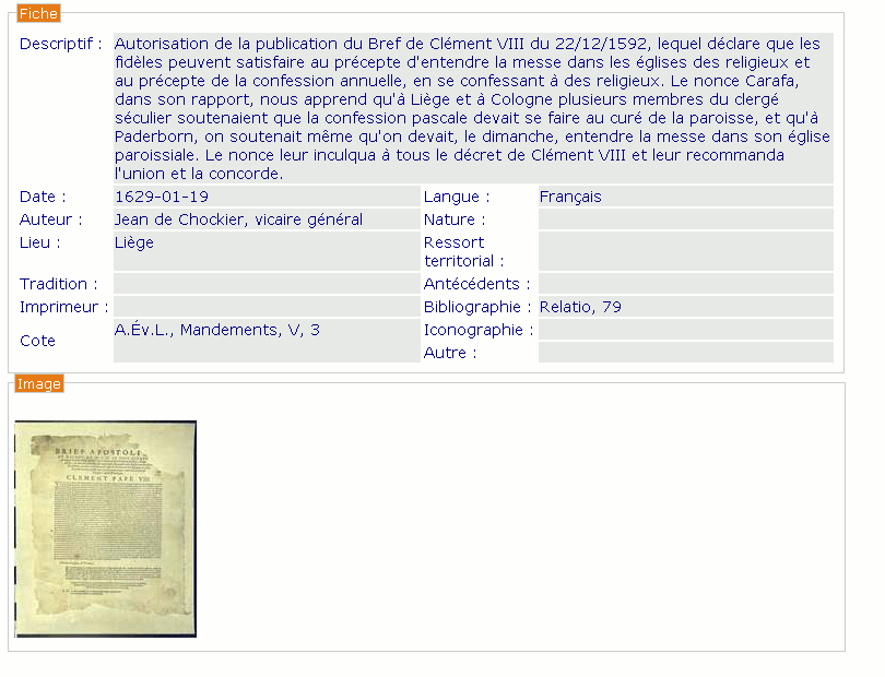 Les fiches sont divisées en deux parties: la partie supérieure renseigne sur les données du document tandis que la partie inférieure affiche l’image du document. Un clic gauche sur l’image permet de la visualiser.