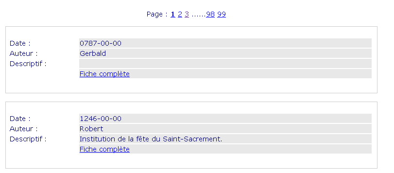 En haut de cette page est affiché le nombre de pages obtenues pour cette recherche, ainsi qu'un bouton de navigation « précédente » « suivante ».