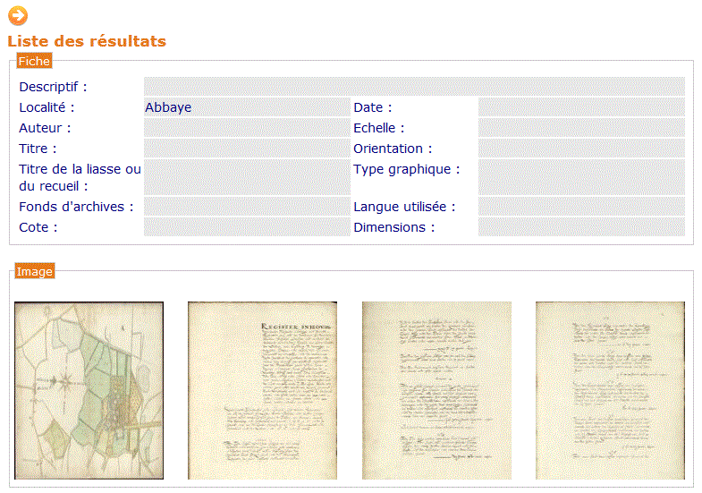 Les fiches sont divisées en deux parties: la partie supérieure renseigne sur les données du document tandis que la partie inférieure affiche l’image du document. Un clic gauche sur l’image permet de la visualiser.